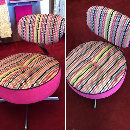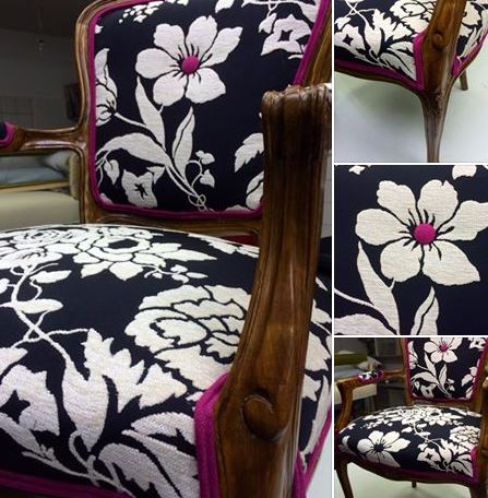 Sehen Sie, wie dieser antike Stuhl neuen Glanz mit einem peppigen Bezugstoff erhalten hat? Zum Stolz der neuen Besitzerin.