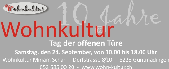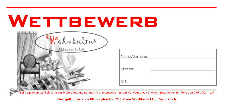 18. August 2006Ich eröffne am 09. September mein neues Ladenlokal an der Vordergasse 37, in 8213 Neunkirch. |
