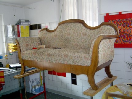 Der alte Bezug, sowie die Polsterung muss 'abgeschlagen' werden. Danach ist ein 'Gang' zum Antikschreiner meistens unumgänglich!